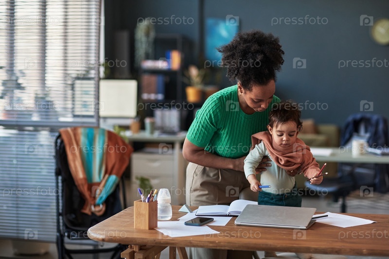 Рабочая мать держит ребенка, используя ноутбук дома