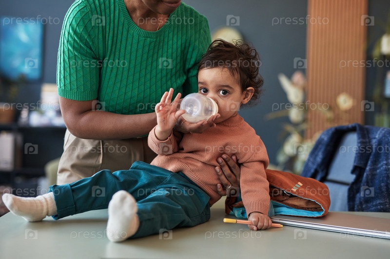 Маленький ребенок пьет из бутылки в уютной современной комнате