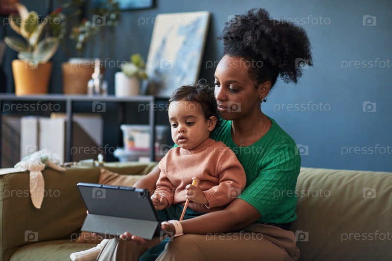 Мать держит ребенка, используя цифровой планшет дома