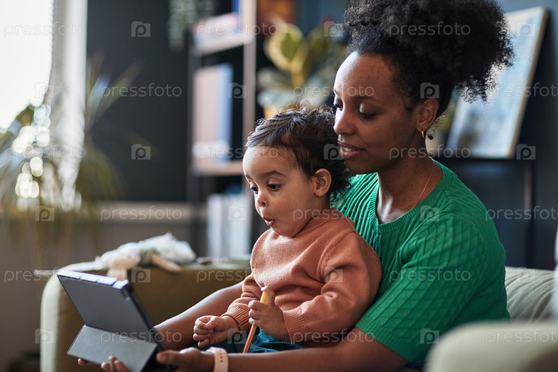 Мать и ребенок смотрят на планшетный экран вместе дома