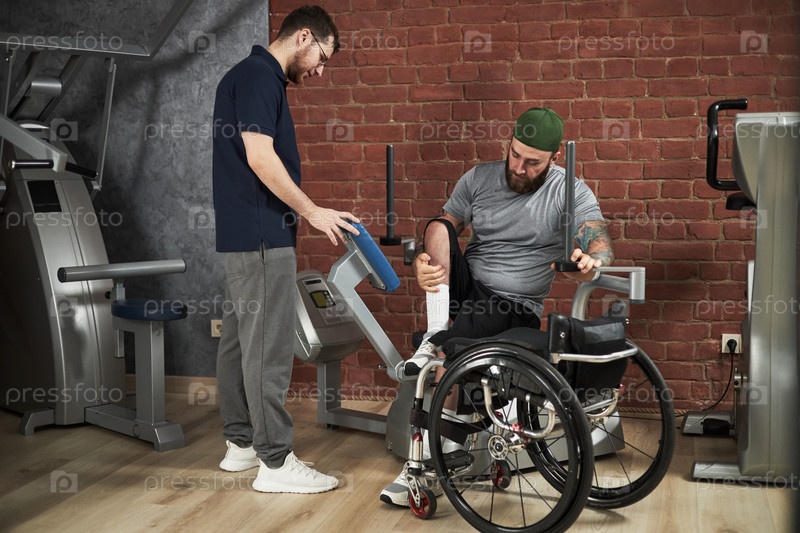 Помощь инвалиду во время упражнений в тренажерном зале