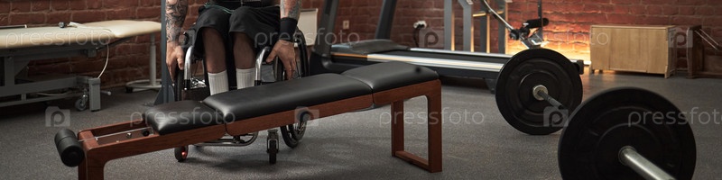 Упражнения в инвалидном кресле в фитнес-центре с тренировочным оборудованием
