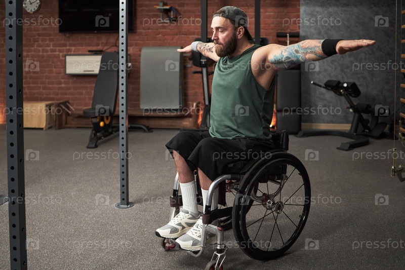 Упражнения в спортзале с инвалидной коляской и татуированными руками