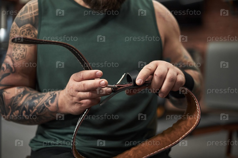Бородатый мужчина регулирует кожаный пояс с татуированными руками