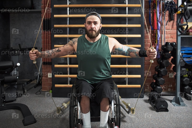 Упражнения в инвалидной коляске на фитнес-центре с использованием оборудования