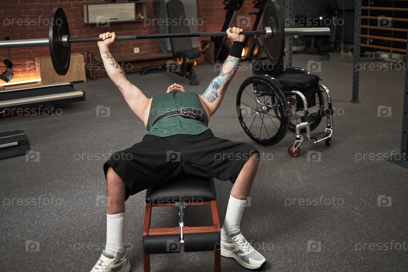 Человек с татуировкой поднимает тяжести в тренажерном зале