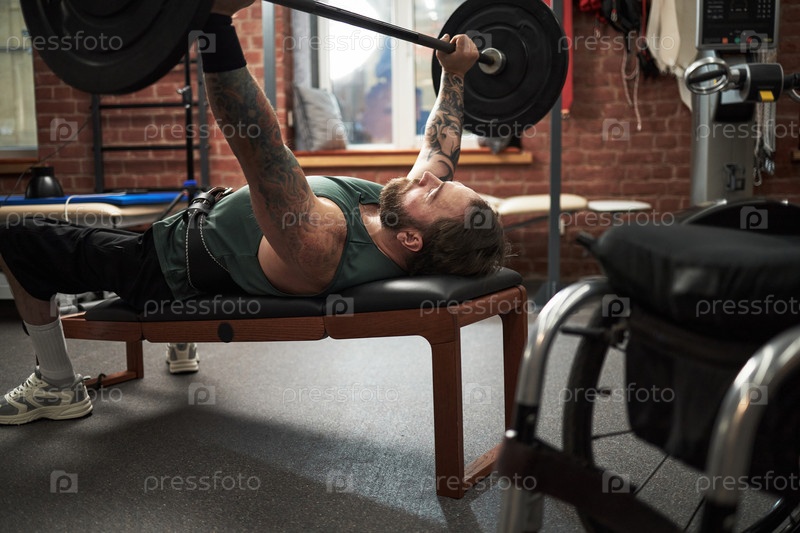 Подъем тяжелой штанги в помещенном тренажерном зале Установка мужчины