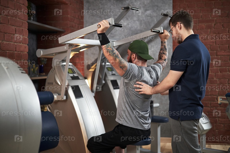 Человек, тренирующийся на Lat Pulldown Machine с тренером-наблюдателем
