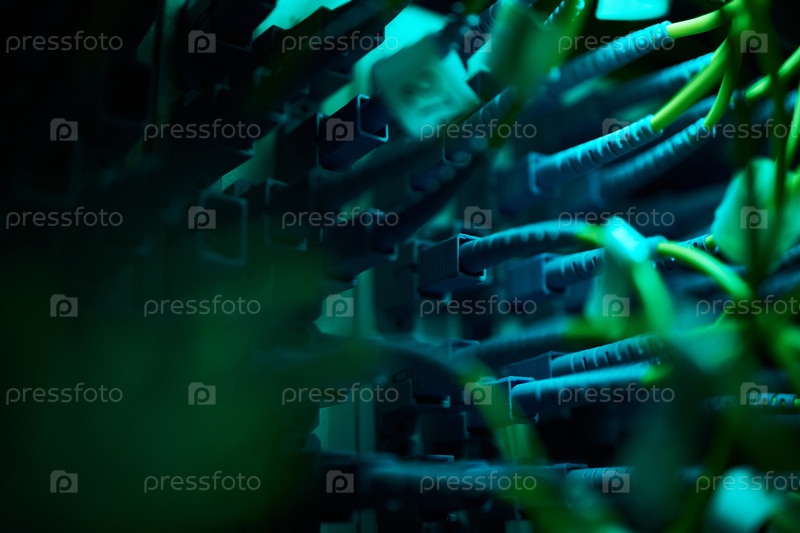 Кабели в центре обработки данных, окруженные сетью оборудования