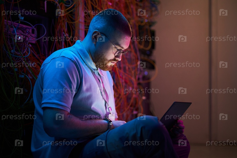 Техник, работающий в серверной комнате на цифровом планшетном устройстве