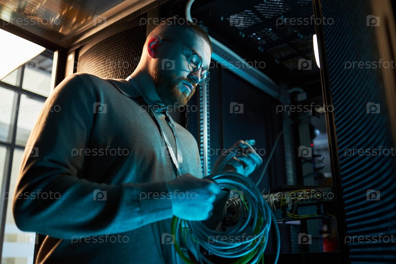 Техник, работающий внутри сетевого серверного зала