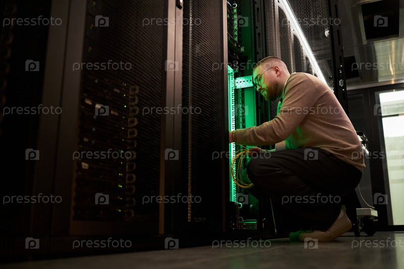 Техник, работающий на сервере в центре обработки данных с зеленым светом
