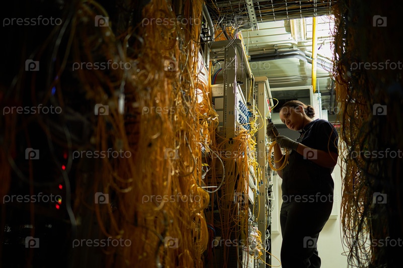 Техник, работающий в серверной комнате с кабелями и сетевым оборудованием