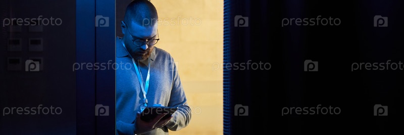 Сосредоточенный мужчина занимается с планшетом в темной комнате
