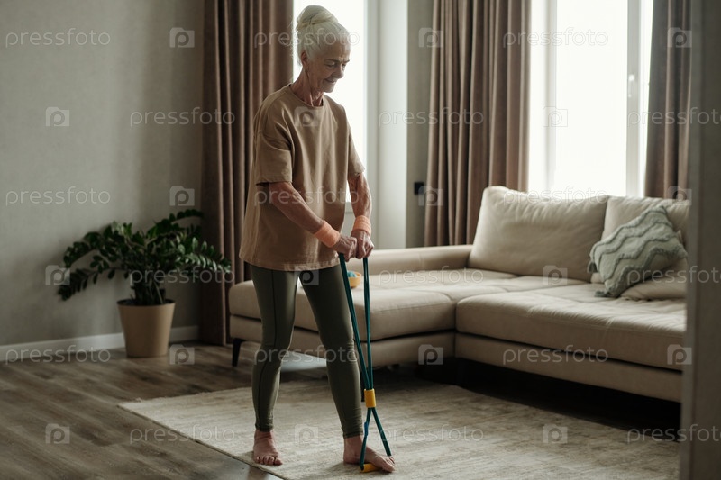 Пожилая женщина использует резистентную ленту для упражнений в помещении