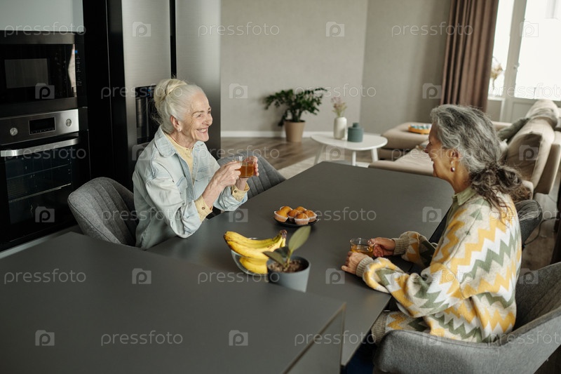 Пожилые женщины наслаждаются напитком в современной кухонной обстановке