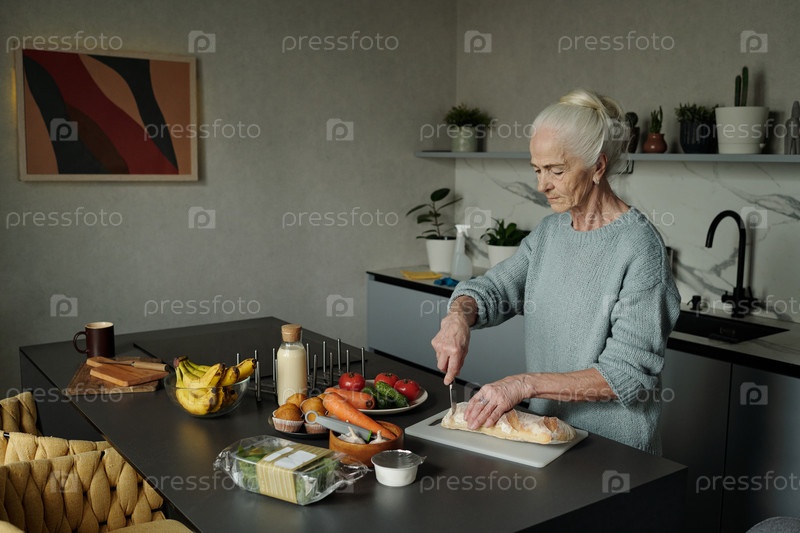 Пожилая женщина готовит еду на современной кухне