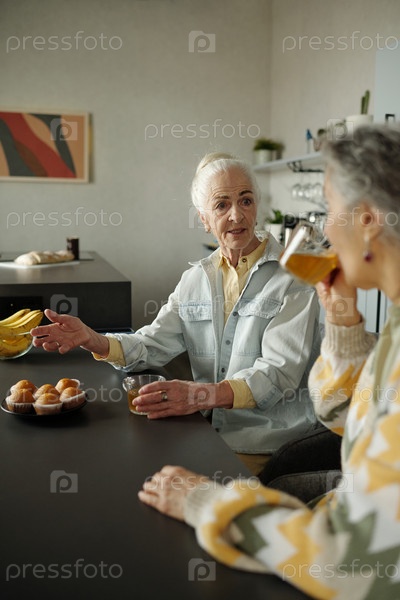 Пожилые люди наслаждаются кофе и выпечкой на современной кухне