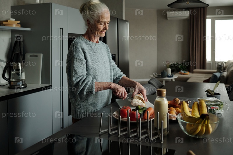 Пожилая женщина готовит здоровый завтрак на современной кухне
