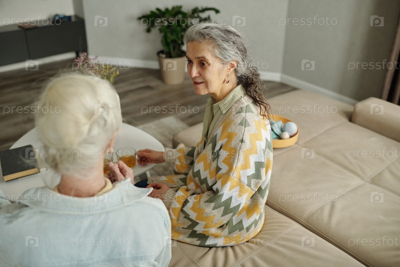 Пожилые женщины ведут разговор в гостиной