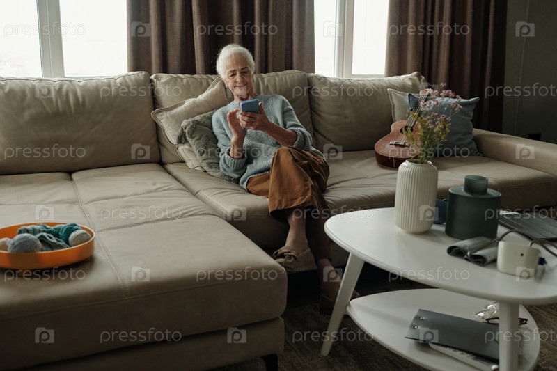 Старший сидит на диване, держа мобильный телефон