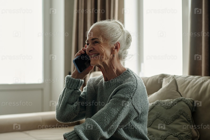 Улыбающаяся пожилая женщина, ведущая телефонный разговор