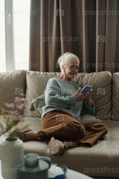 Пожилая женщина, сидящая комфортно с помощью смартфона