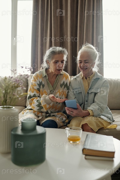 Пожилые женщины используют смартфон, сидя на диване