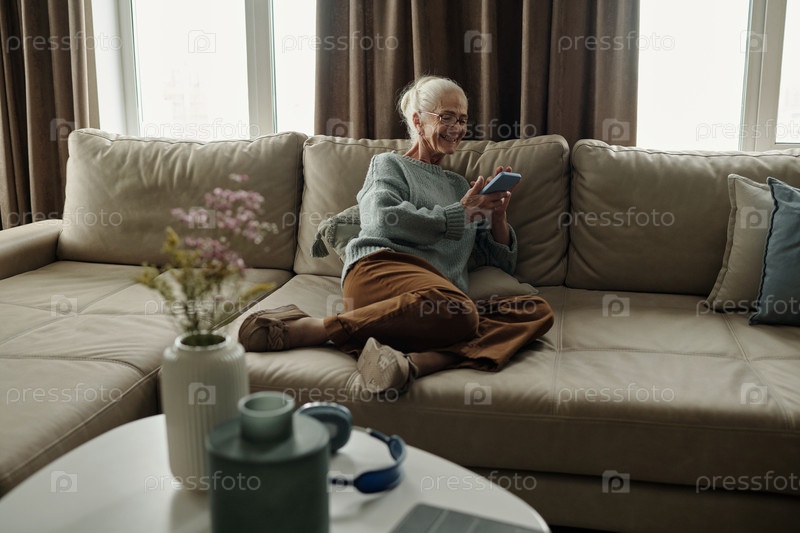 Улыбающаяся пожилая женщина использует смартфон на уютном диване