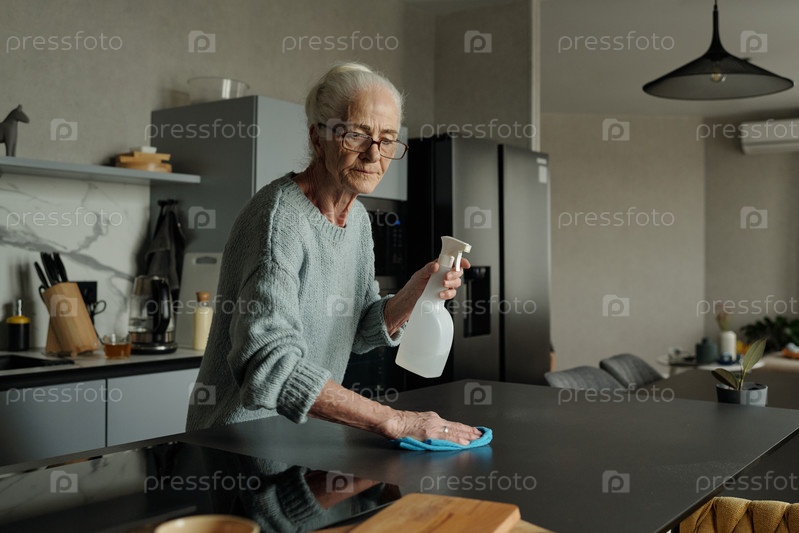 Портрет пожилой женщины, держащей бутылку с спреем на современной кухне