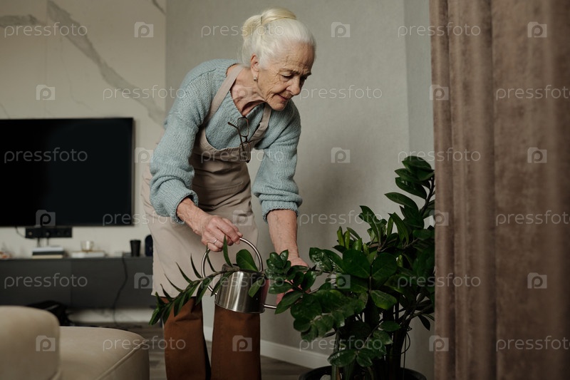 Пожилая женщина поливает комнатные растения с помощью оросительной канистры