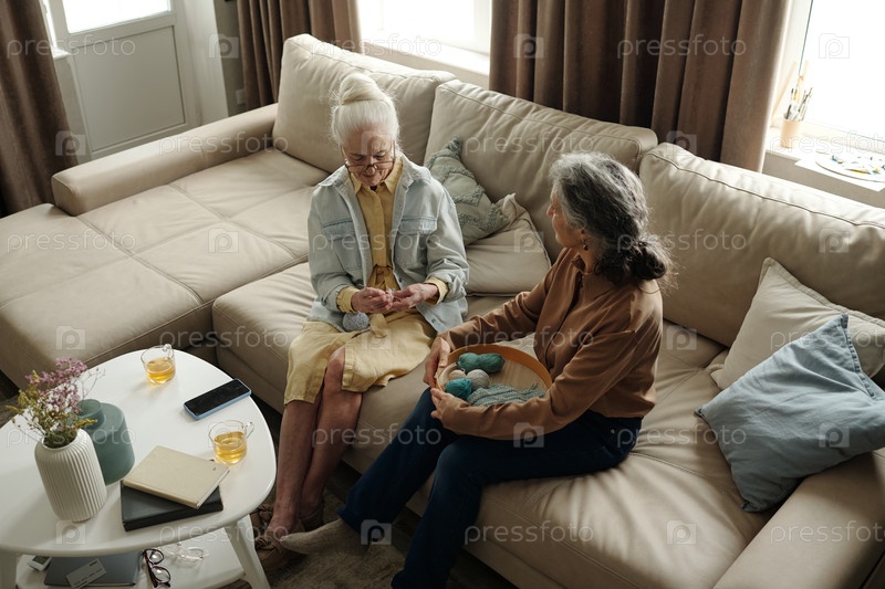 Пожилая женщина занимается вязанием вместе со своим спутником на диване
