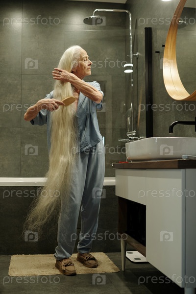 Пожилая женщина чистит длинные волосы в современной ванной