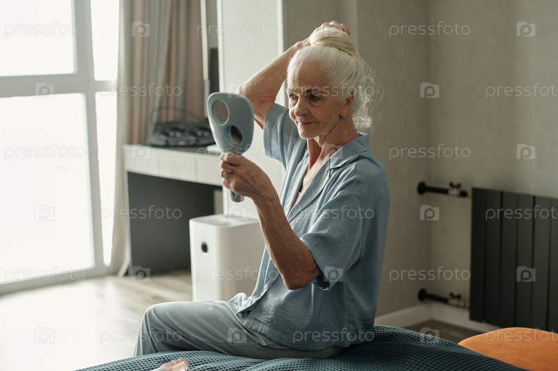 Пожилая женщина расчесывает волосы с помощью ручного зеркала