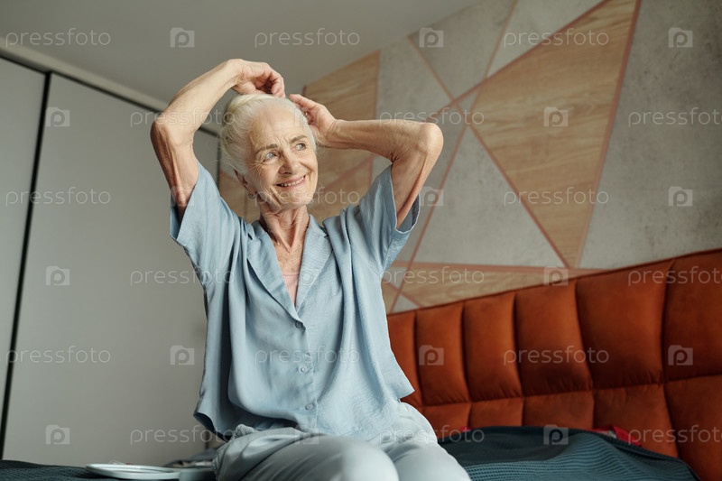 Портрет пожилой женщины, расслабляющейся и растягивающейся утром