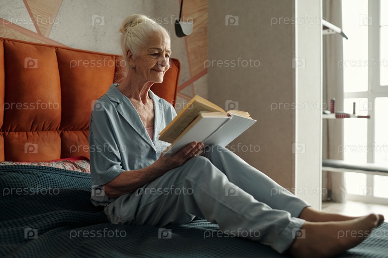 Пожилая женщина сидит на кровати, читает книгу в спальне