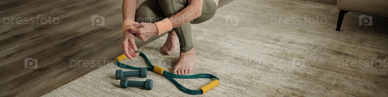Практика йоги с помощью резистентной группы и гантели