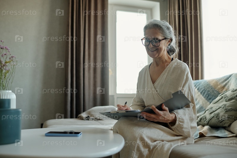 Пожилая женщина использует планшет, сидя на диване