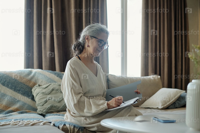 Портрет пожилой женщины, пишущей на планшете с улыбкой