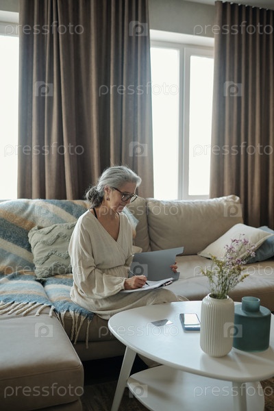 Старшая женщина просматривает документы на бежевом диване
