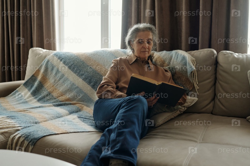 Пожилая женщина сидит на диване, читает книгу у окна