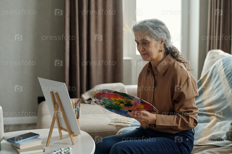 Старшая женщина, занимающаяся живописью на холсте дома