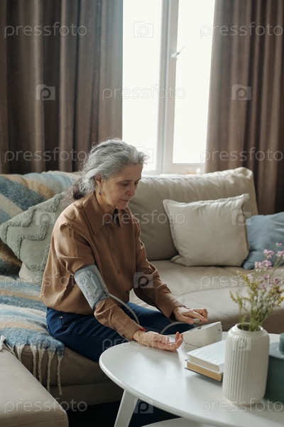 Пожилая женщина проверяет кровяное давление сидя в гостиной