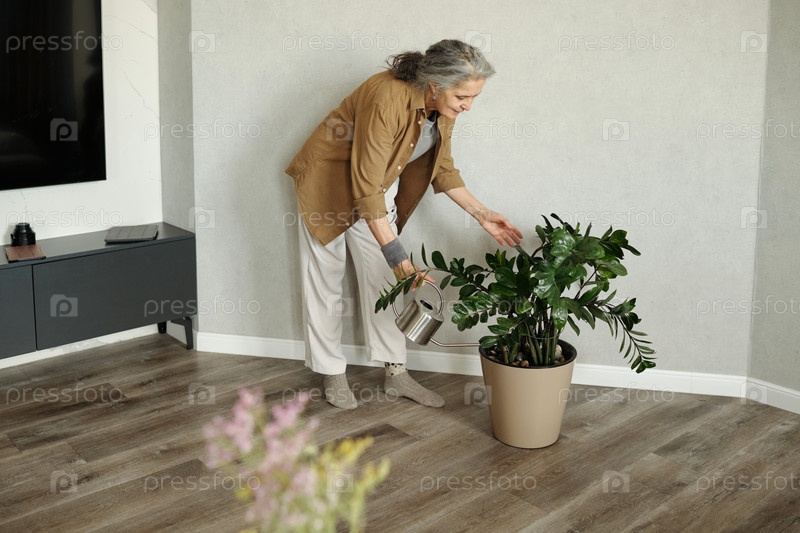 Женщина поливает горшочное растение в гостиной Senior Room Setting