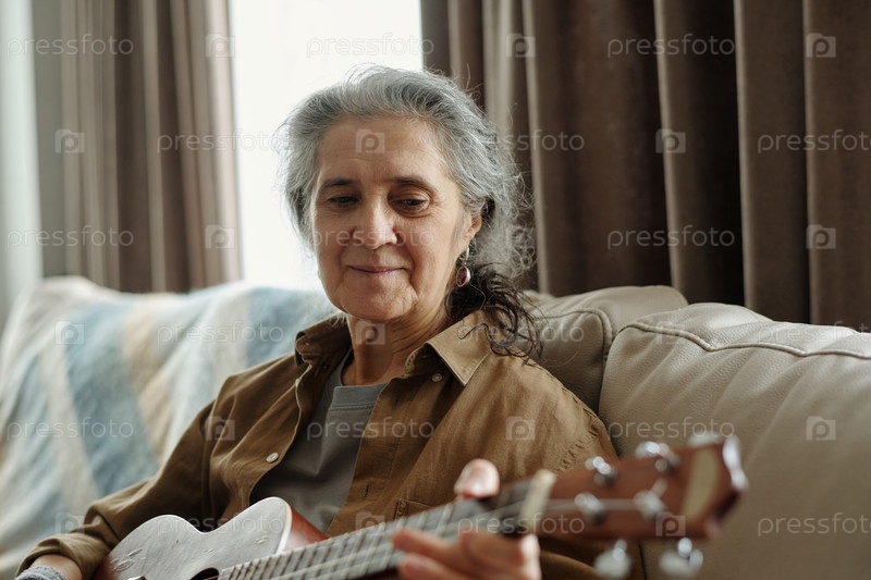 Портрет пожилой женщины, играющей на акустической гитаре на диване