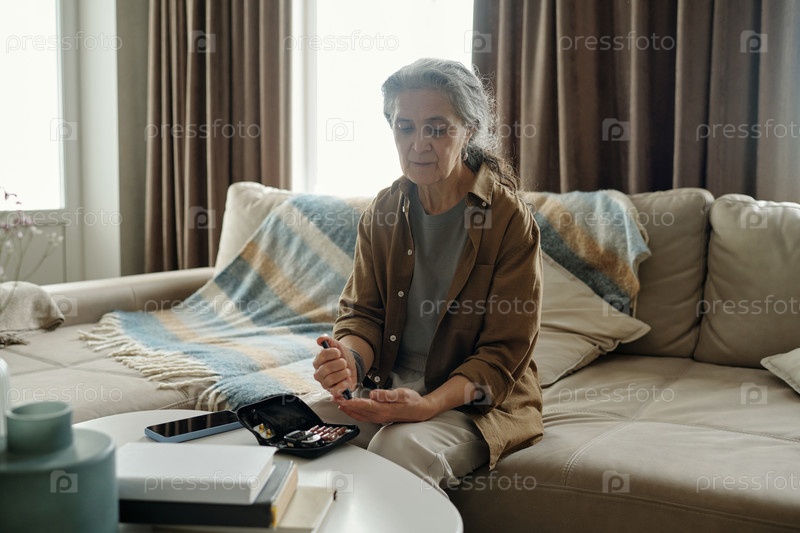 Пожилая женщина сидит на диване в гостиной, держа лекарства
