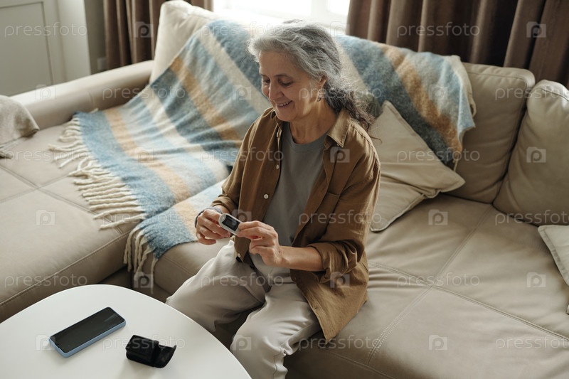 Улыбающаяся пожилая женщина использует современные технологии дома