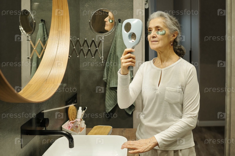 Пожилая женщина наносит крем для ухода за кожей в зеркало ванной