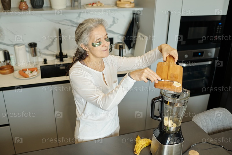 Пожилая женщина готовит смузи с помощью блендера на современной кухне