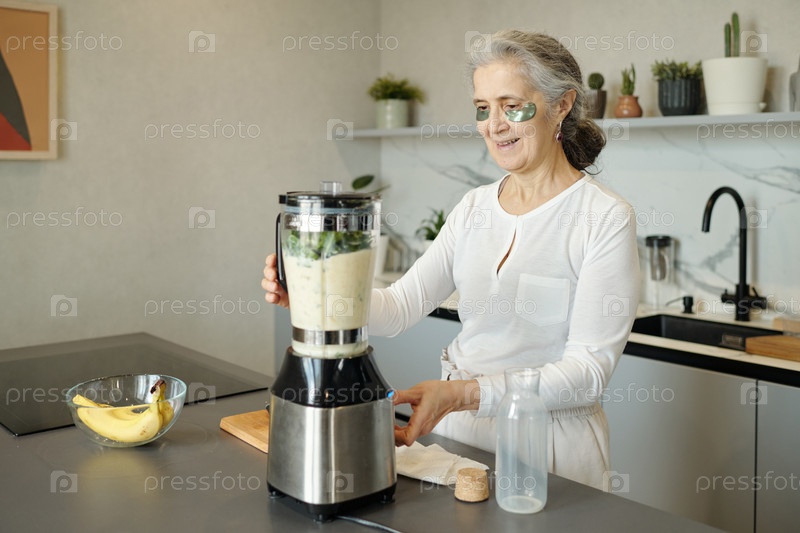 Старшая женщина готовит смузи на кухне